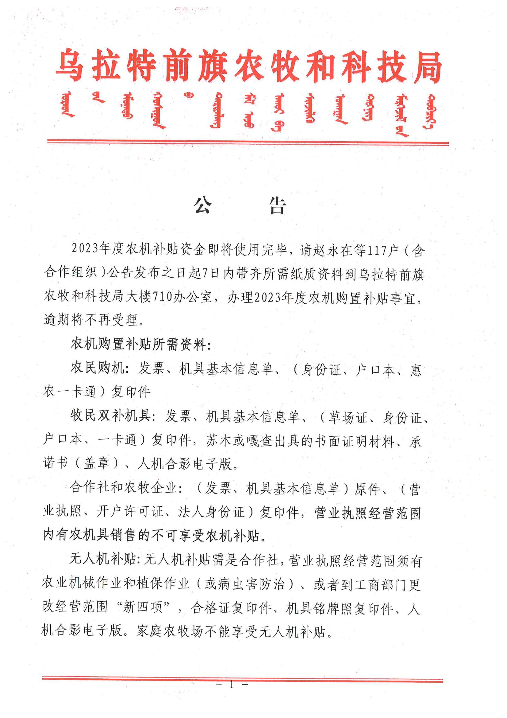 乌拉特前旗人民政府办公室关于印发《乌拉特前旗2023年耕地深松作业补助实施方案》的通知