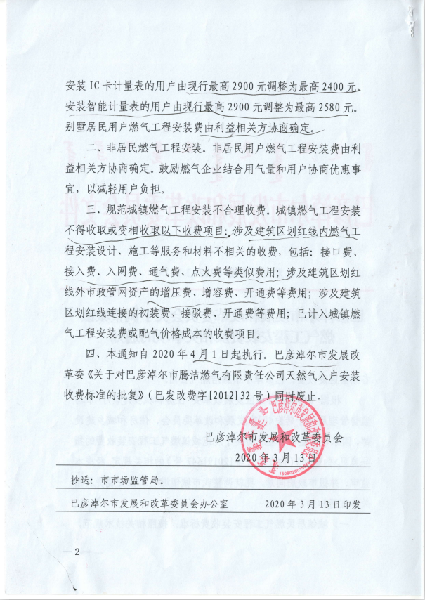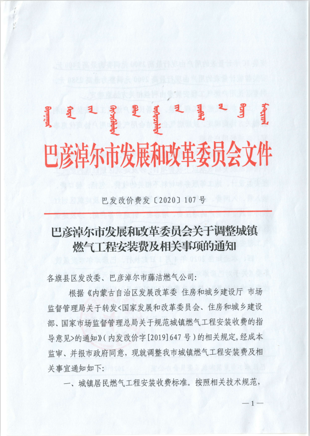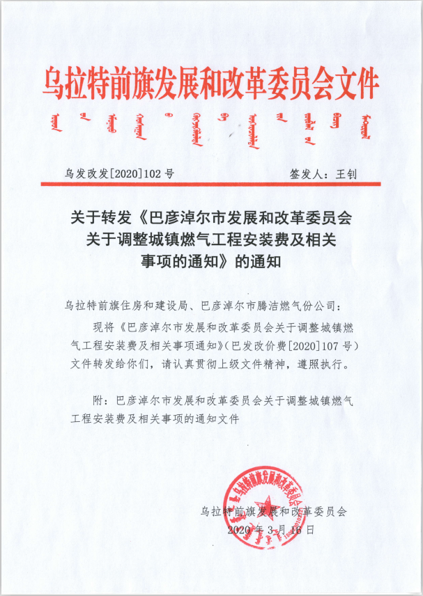 关于转发《巴彦淖尔市发展和改革委员会关于调整城镇燃气工程安装费及相关事项的通知》的通知