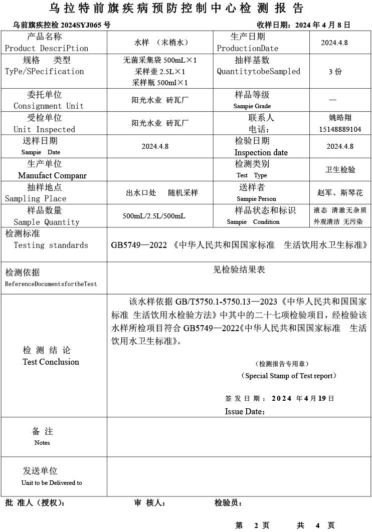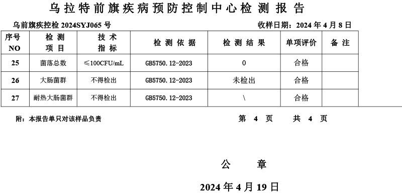 乌拉特前旗乌拉山镇集中式生活饮用水水质报告(2024年4月)