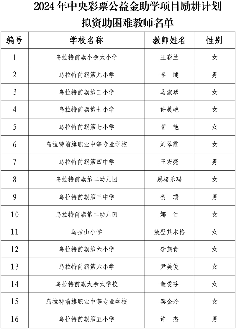 根据《财政部 教育部关于印发中央专项彩票公益金支持教育相关项目资金管理办法的通知》(财教﹝2021﹞156号)和内蒙古自治区助学中心《关于开展2024年中央专项彩票公益金教育助学项目的通知》(内助学中心﹝2024﹞18号)文件要求,现对评审通过的16名拟资助困难教师名单在政府网站进行公示,公示期10天,从2024年8月6日至8月15日。在公示期间,如有疑议可来电来函反映问题。举报电话:0478—3606658,0478—3606639。电子邮箱:wltqqzzzx@163.com。