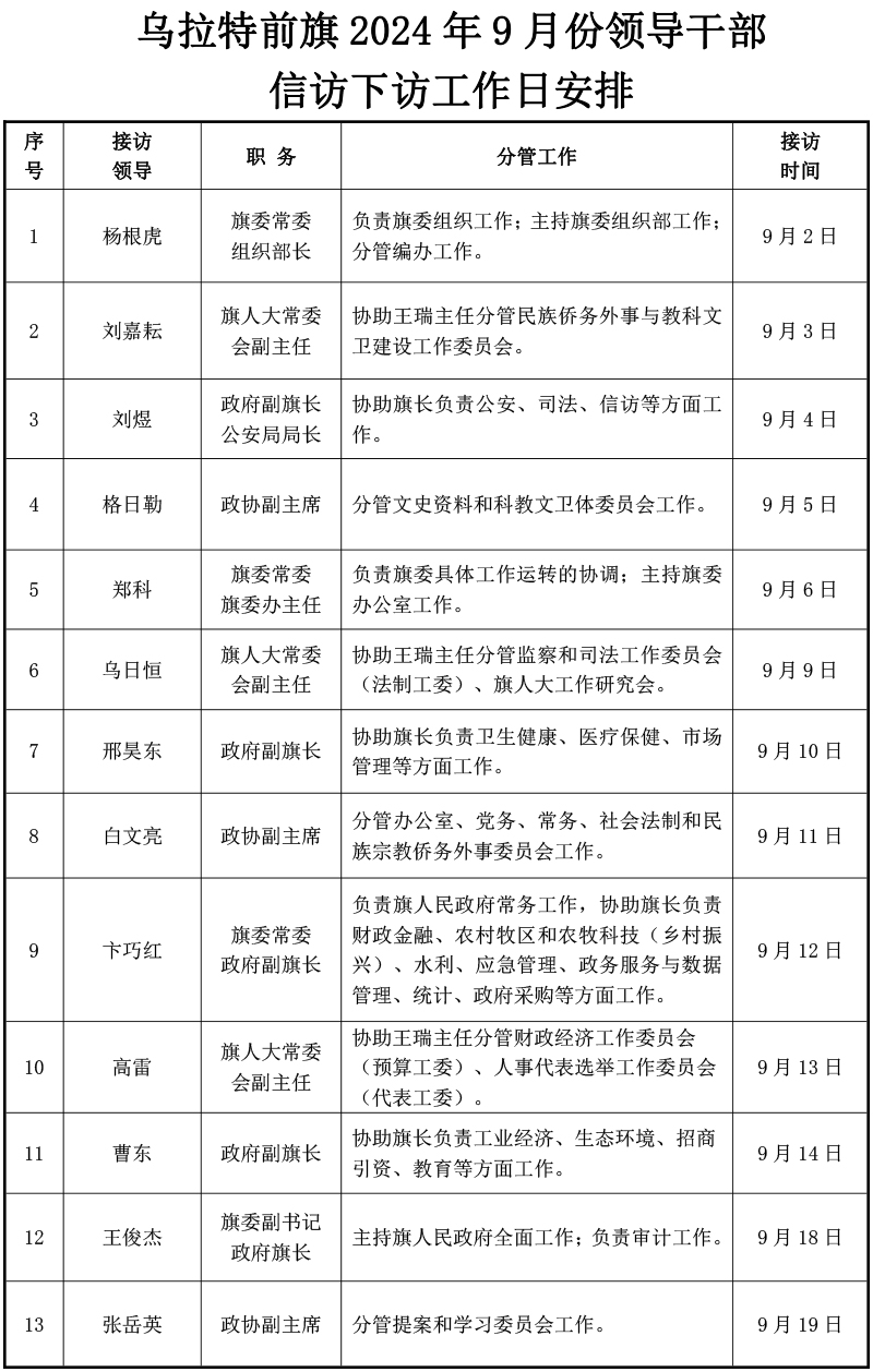 乌拉特前旗2024年9月份领导干部信访下访工作日安排