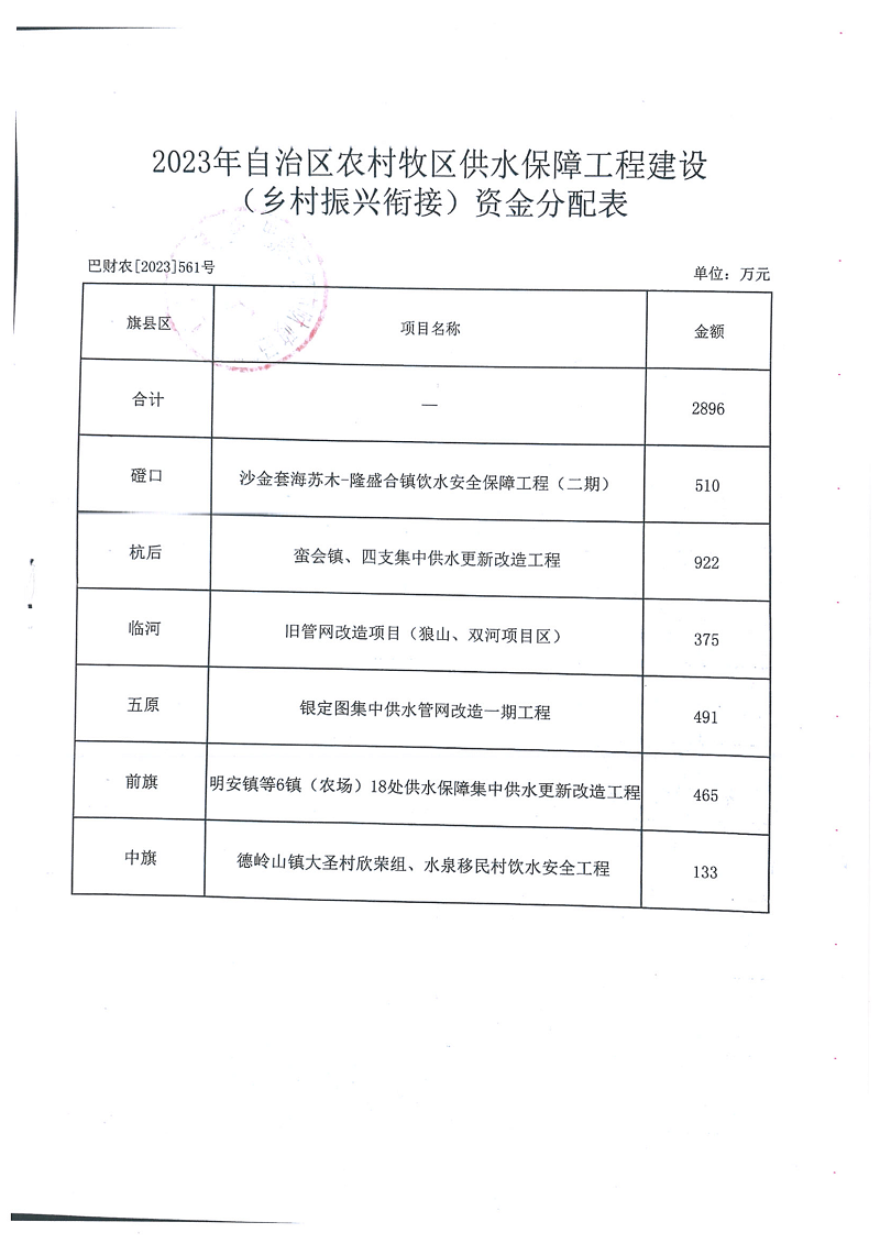 现将财政分配到水利局的2023年自治区农村牧区供水保障工程建设(乡村振兴衔接)资金465万元,通过旗政府网站进行公告,欢迎社会各界监督。