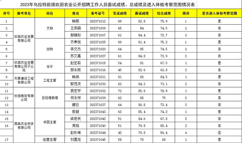 关于公布2023年度乌拉特前旗玖田农业发展有限公司公开招聘工作人员面试成绩、总成绩及进入体检、考察范围情况的公告