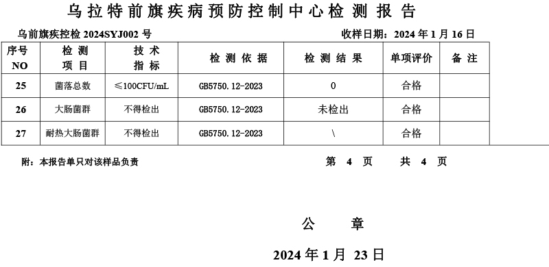 乌拉特前旗乌拉山镇集中式生活饮用水水质报告(2024年1月)