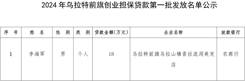 关于乌拉特前旗2024年创业担保贷款第一批发放名单的公示