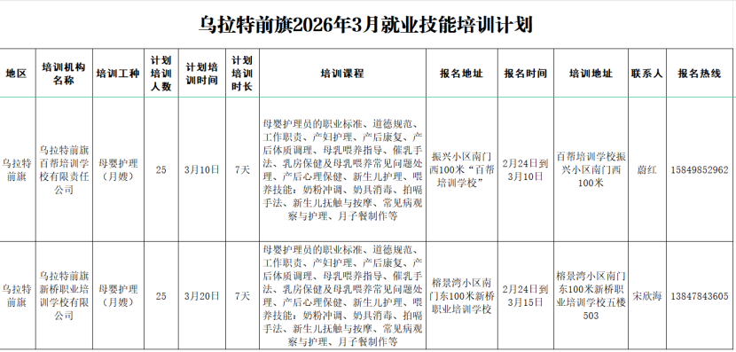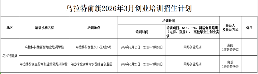 乌拉特前旗2026年3月就业创业培训招生计划
