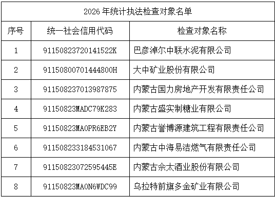 乌拉特前旗统计局关于公示2026年统计执法检查对象名单的通告