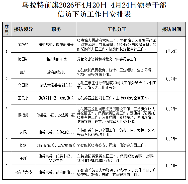 乌拉特前旗领导2026年4月20日-4月24日接访安排公示