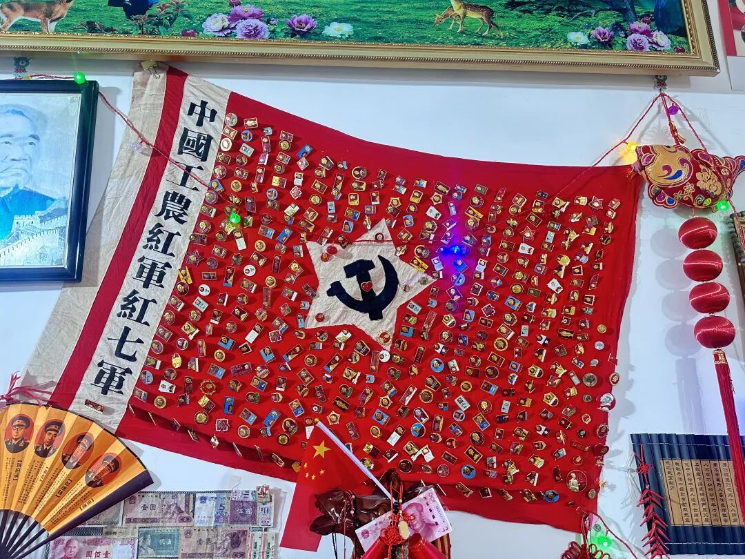 在乌拉山镇居民马迎春的工作室记者看到,军旗上的毛泽东像章最为醒目。上百枚大小不一、材质各异的像章错落别在旗面,在灯光下折射出厚重的历史光泽。他指尖轻捏一枚铝质像章,小心翼翼地调整位置,每一枚像章都承载着他与红色文化的深厚羁绊。