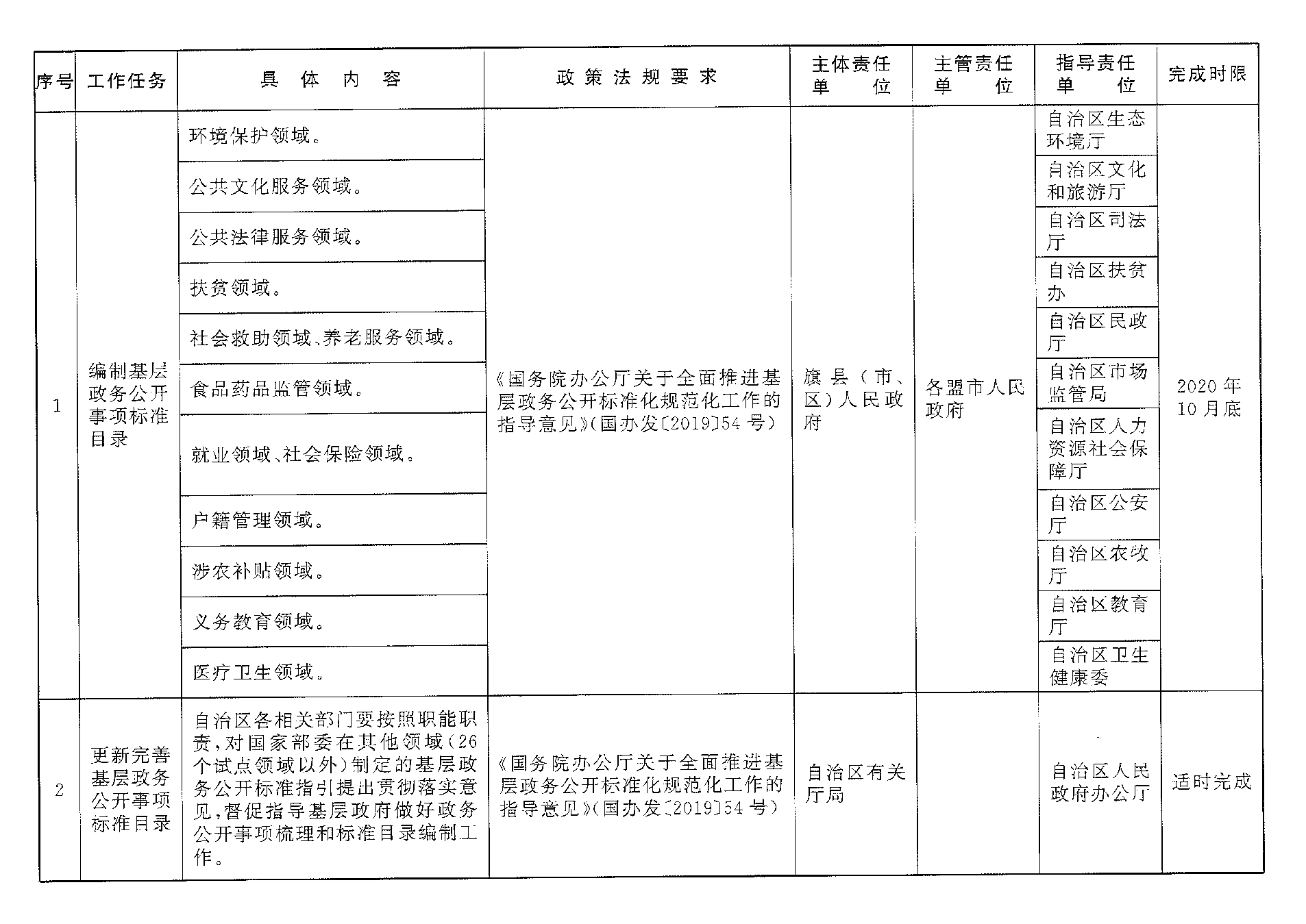 (一)编制基层政务公开事项标准目录。基层政府(包括旗县级人民政府和苏木乡镇人民政府、街道办事处)要对照国务院有关部门印发的26个试点领域标准指引及有关要求,结合本级政府权责清单、公共服务事项清单等,全面梳理细化26个试点领域政务公开事项,除有法律、法规、规章等明确规定不予公开的,其余均应列入公开事项。基层政府应于2020年10月底前编制完成包括公开事项名称、内容、依据、时限、主体、渠道、公开对象和方式等要素的本级政府政务公开事项标准目录,作为本地区开展政务公开工作的基本遵循。