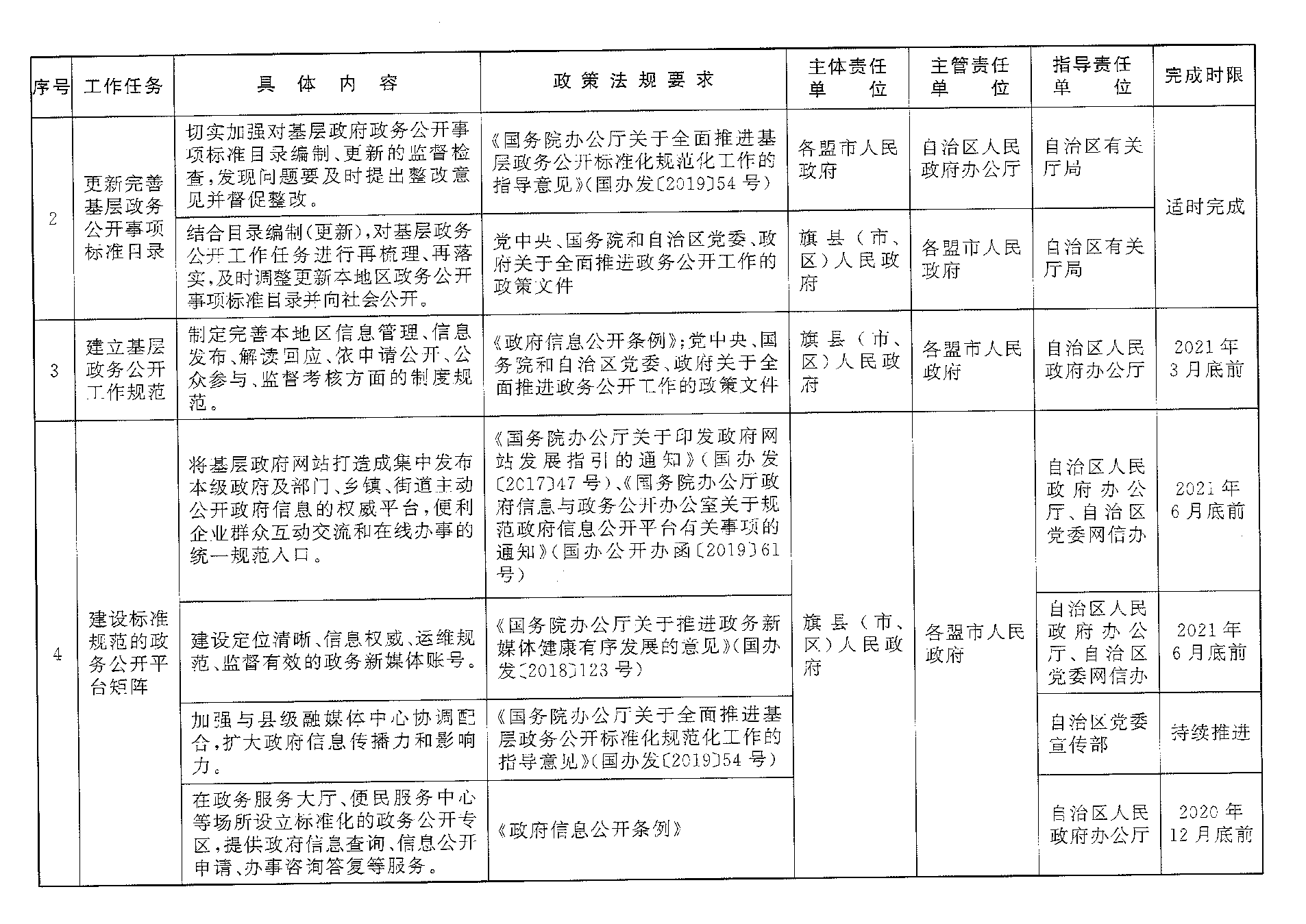 (一)建立基层政务公开工作规范。基层政府要严格落实国家和自治区关于全面推进政务公开工作的要求,认真贯彻执行《中华人民共和国政府信息公开条例》,制定完善本地区信息管理、信息发布、解读回应、依申请公开、公众参与、监督考核等方面的制度规范,于2021年3月底前在本地区政府信息公开平台向社会公开。同时,鼓励将政务公开事项标准目录及制度规范嵌入部门业务系统,并适时列入政府绩效考核政务公开指标体系,促进公开工作与其他业务工作融合发展。