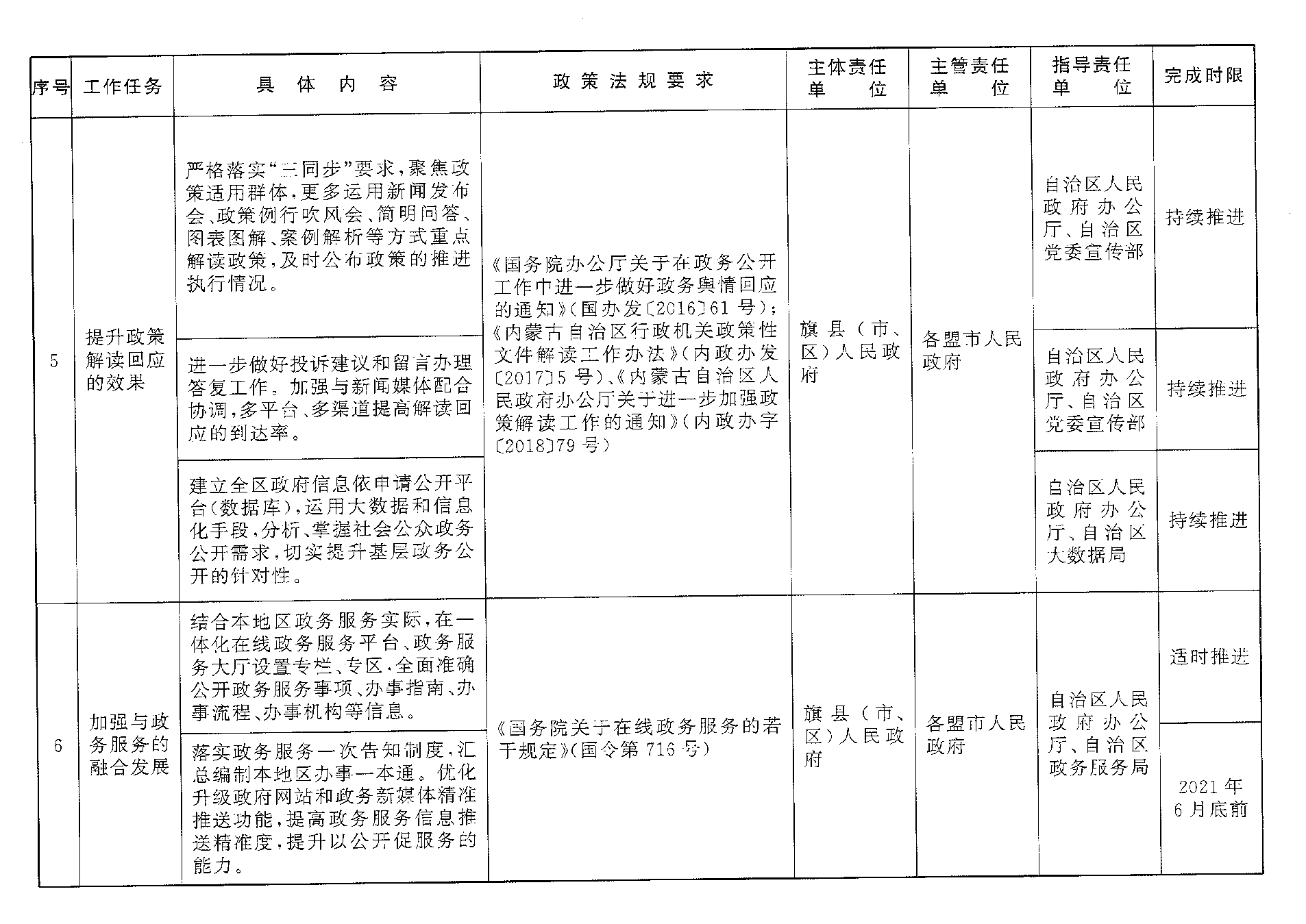 (一)明确责任分工。自治区人民政府统一领导全区基层政务公开标准化规范化工作。各盟行政公署、市人民政府要按照属地原则做好监督指导工作,统筹推进本地区基层政府及时、高效完成政务公开标准化规范化工作各项任务。基层政府对本行政区域基层政务公开标准化规范化工作负总责,要切实履行主体责任,精心组织实施,强化经费保障,根据工作需要成立专班(专项工作组),确保各项工作落到实处。自治区各相关部门要按照职能职责,做好对基层政府政务公开标准化规范化工作的监督和指导。